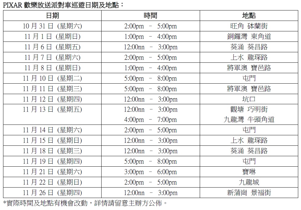 而全港首架「PIXAR歡樂放送派對車」更將由明天起至11月26日遊走全港鬧市,一眾以主題角色打扮的派對專員會即場大派主題精品,粉絲們萬勿錯過!